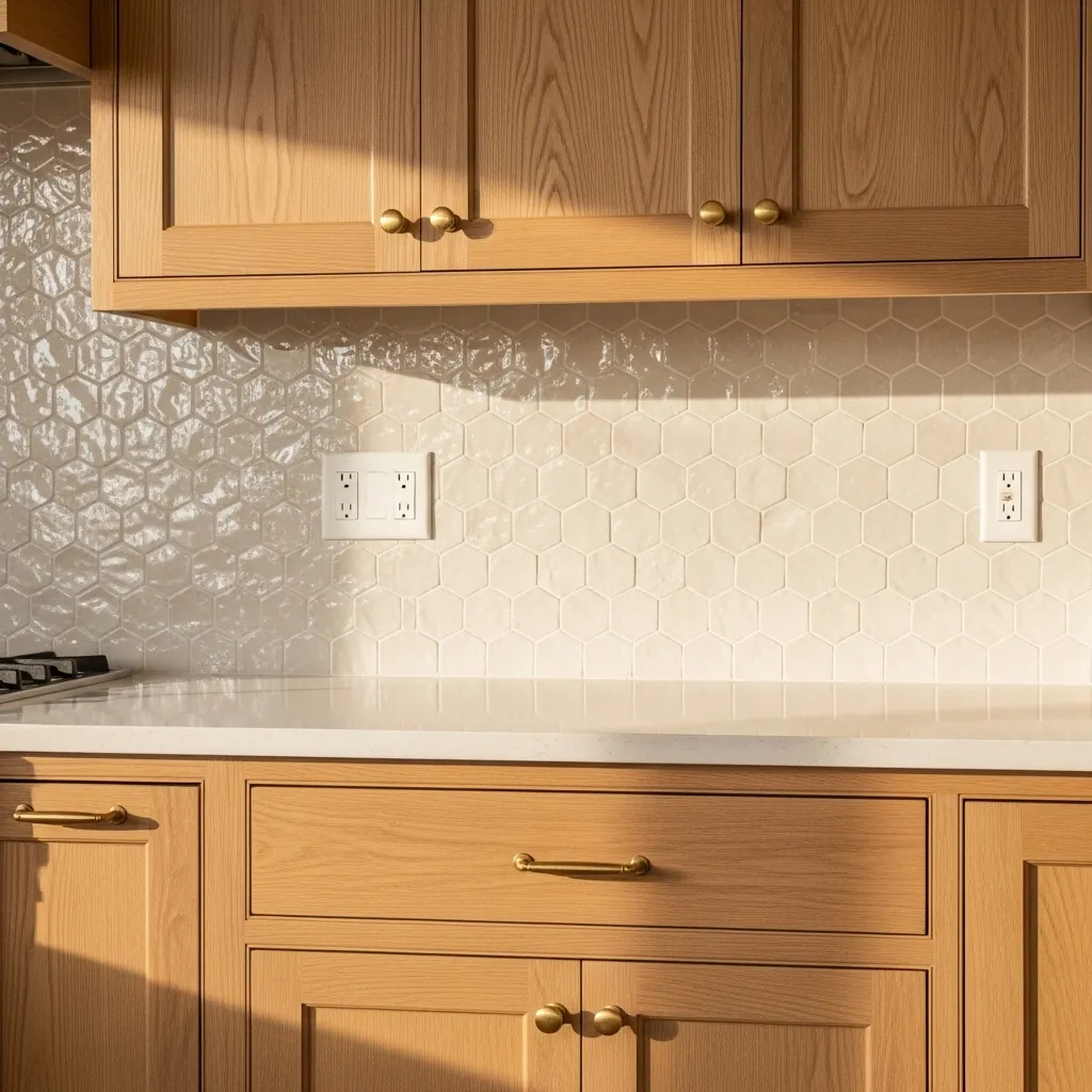 The warm off-white tone of zellige tile is the specific color that creates the most beautiful relationship with white oak — not bright white, which would create a high-contrast separation between the tile and the wood, but the warm, slightly cream-toned off-white that shares the oak’s warmth direction while being clearly a different material. The zellige tile at this tone appears almost as though it has captured the oak’s warmth in a ceramic form, creating a backsplash that feels specifically connected to the cabinetry material rather than independently chosen.
