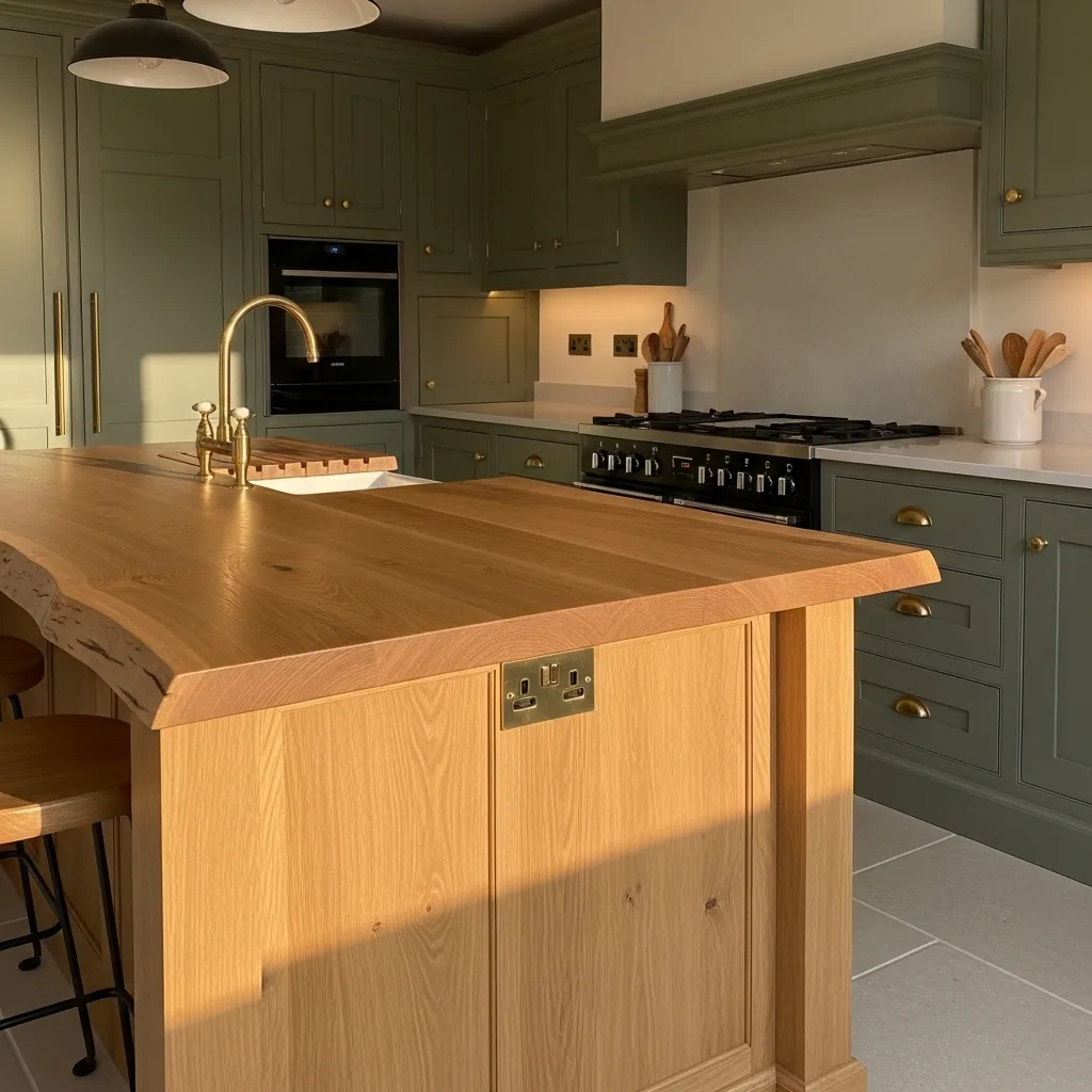 A white oak island against painted perimeter cabinetry creates the most dynamic and most visually interesting kitchen configuration available — it gives the kitchen’s primary social and functional piece the warmth and natural character of real wood grain while allowing the perimeter cabinetry to provide color, sophistication, and visual anchoring without the painted cabinets competing with the wood for primacy. The island is the warm, natural, approachable center; the perimeter is the sophisticated, colored, architectural envelope; and the contrast between them creates a kitchen with genuine visual complexity that a all-oak or all-painted kitchen can’t achieve.