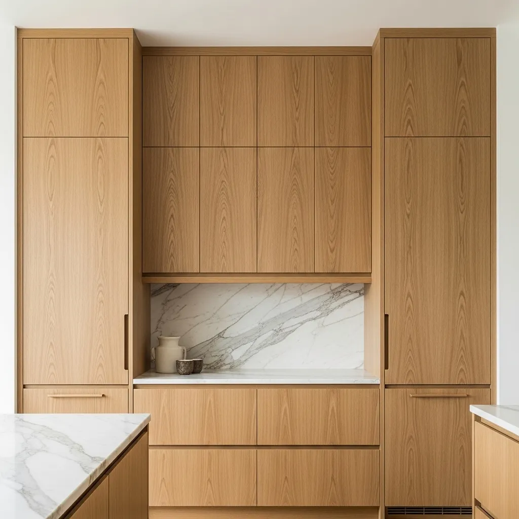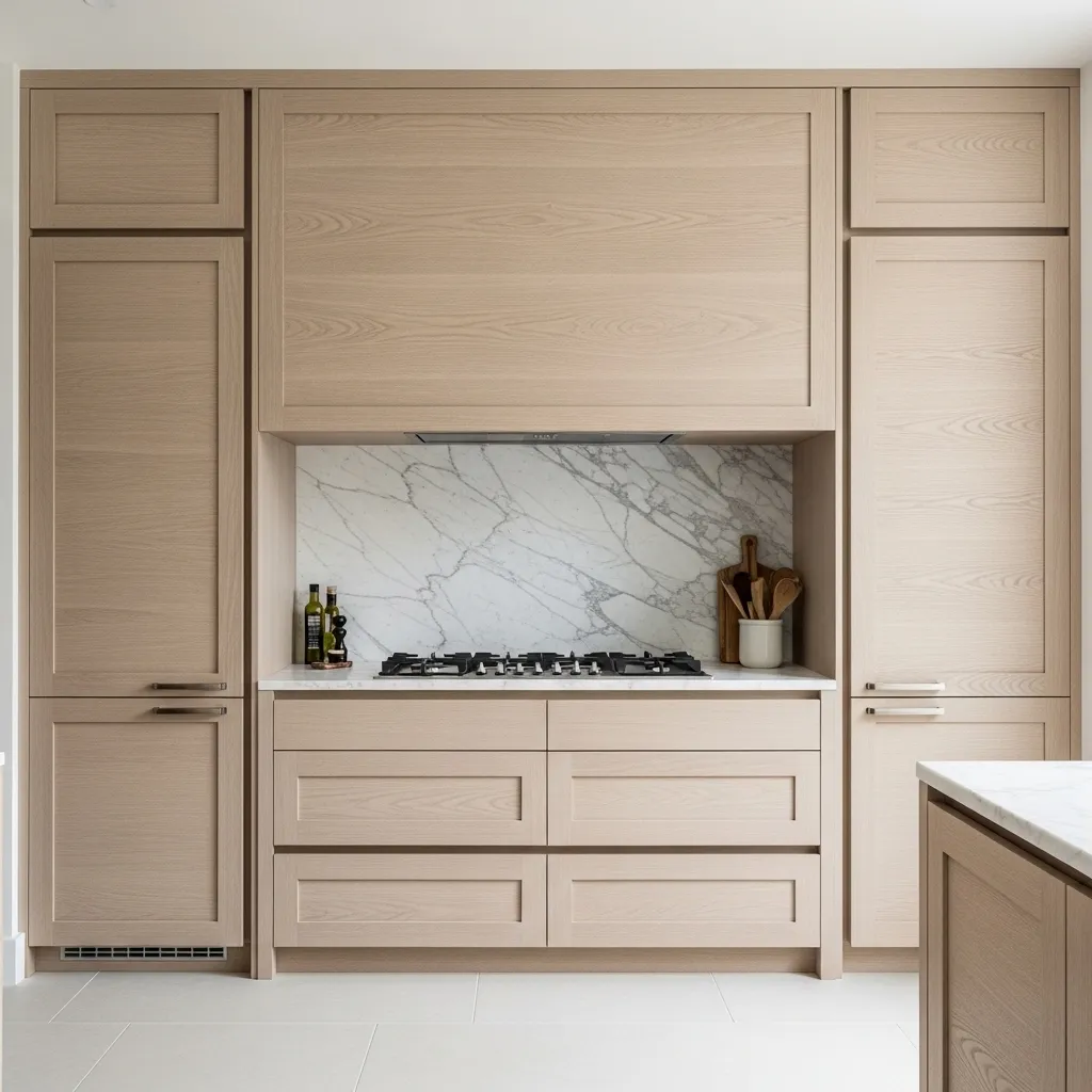 Handleless white oak cabinetry — using push-to-open mechanisms or integrated grip edges that eliminate visible hardware entirely — creates the most contemporary and most architecturally resolved expression of white oak cabinetry available, because it allows the wood grain to be the uninterrupted primary surface of the kitchen without hardware punctuating it at regular intervals. The handleless kitchen creates a surface of continuous warm wood grain from one end of the kitchen wall to the other, and that continuity is what makes it read as architectural rather than just as good cabinetry.