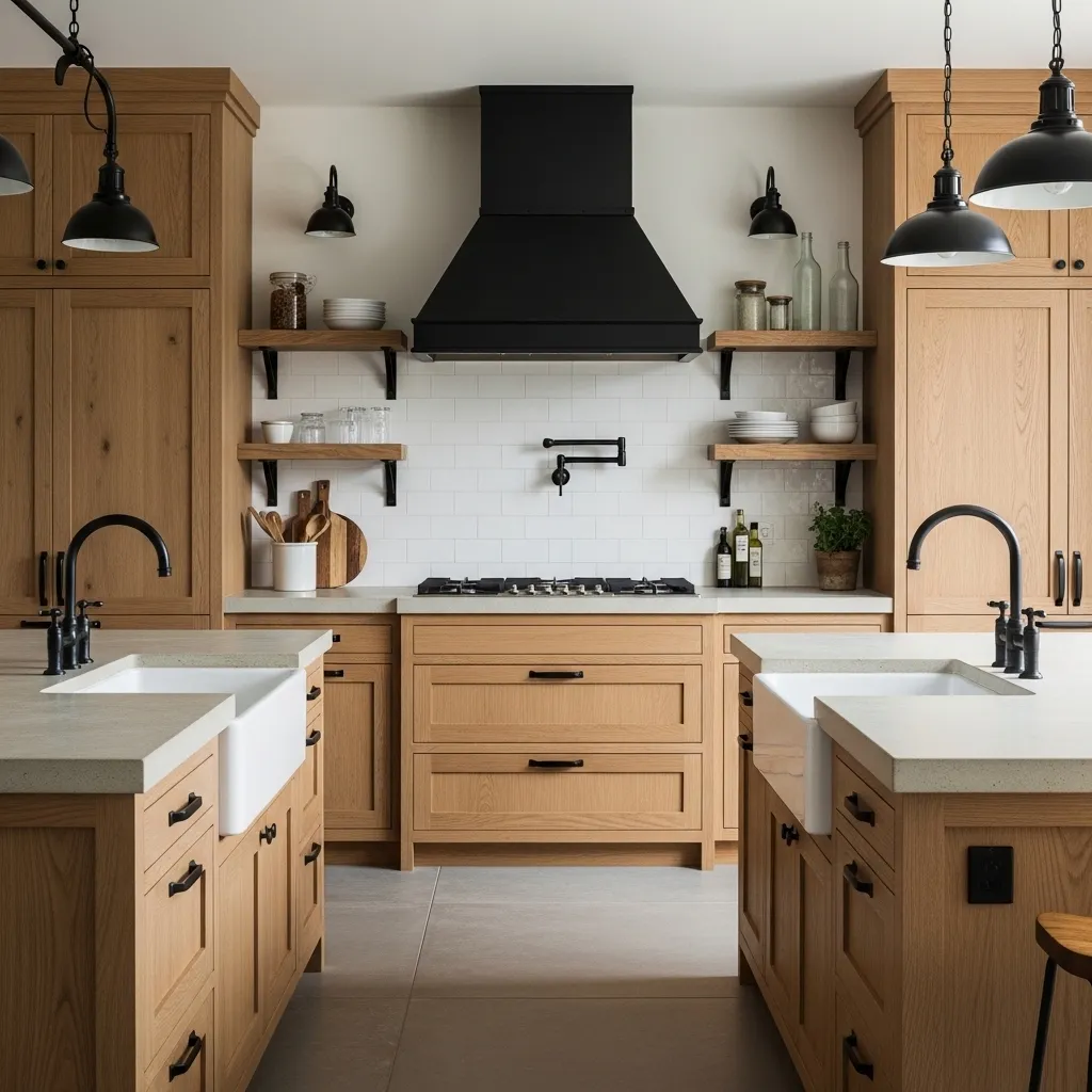 White oak cabinetry with warm concrete countertops and matte black industrial accents creates the kitchen aesthetic that most successfully bridges the rustic warmth of natural wood with the industrial precision of contemporary material choices — the oak provides the organic warmth and natural character, the concrete provides the modern material honesty and weight, and the matte black industrial accents provide the contemporary graphic precision that prevents the oak-and-concrete combination from reading as purely rustic.