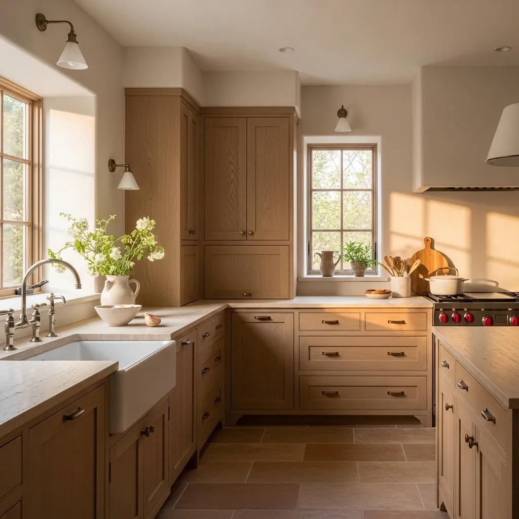 The design challenge of an all-oak kitchen is preventing the uniformity of a single material from reading as monotonous — which requires ensuring that the stone countertops, the floor material, and the wall surfaces not covered by cabinetry provide genuine material contrast that makes the oak appear richer and more vivid than it would in an all-oak room with no contrasting materials. The warm travertine countertop, the stone tile floor, and the painted or plastered wall surfaces between and beside the cabinetry all serve this function — they’re not interruptions of the oak aesthetic but the contrasting materials that allow the oak to be fully appreciated, the other instruments in the orchestra that allow the primary voice to be most clearly heard.