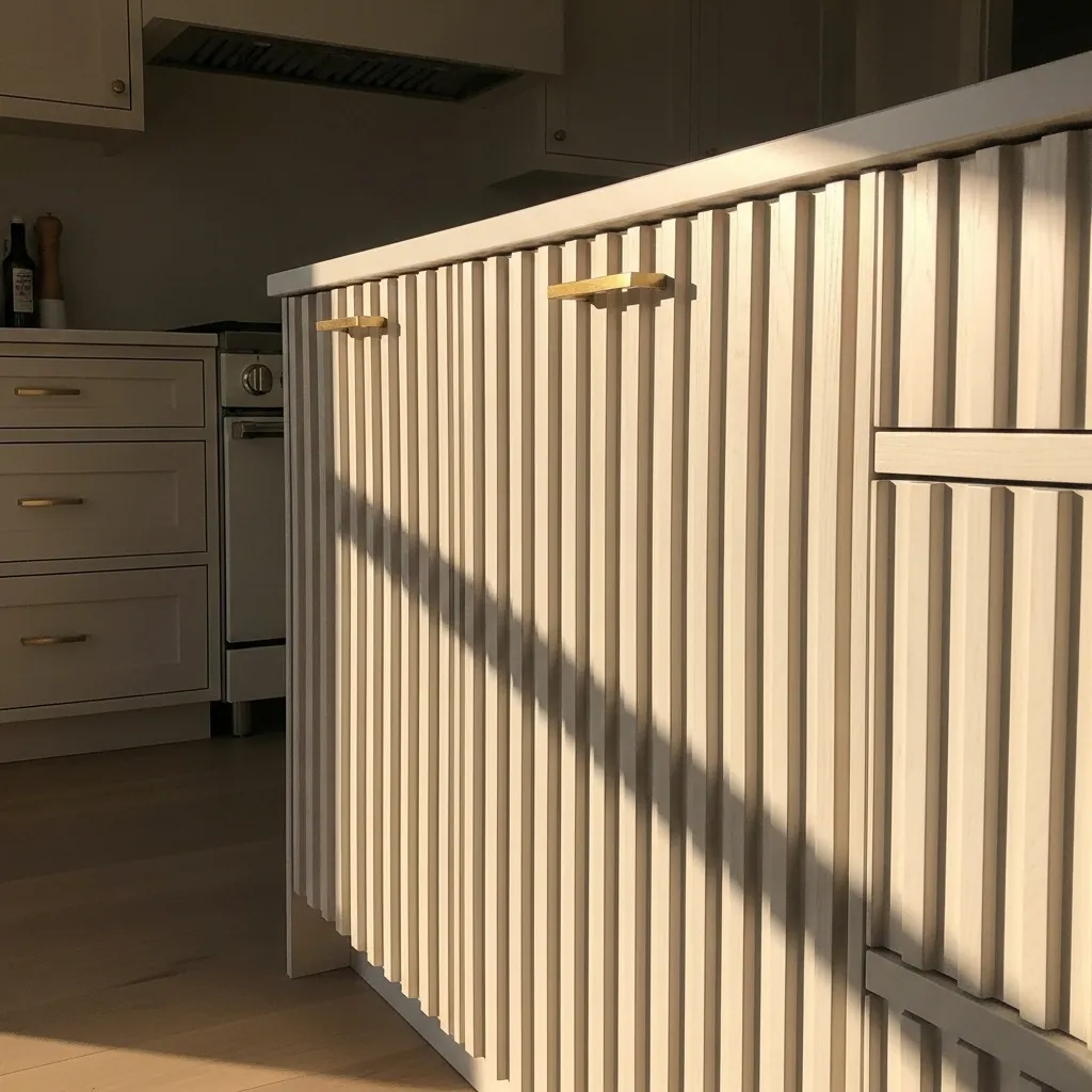 The strategic application of fluting — on the island alone rather than throughout the kitchen, or on the lower cabinets only, or on a single feature cabinet section — creates a focal point within the kitchen that draws the eye and communicates design intention without making the kitchen feel over-worked. A fully fluted kitchen (every cabinet front fluted) can feel visually busy and can make the kitchen feel like it’s trying too hard; a selectively fluted kitchen where the fluting appears on the most significant piece (the island, the pantry column, the range surround) creates a kitchen where the fluted detail is a designed moment rather than an overall aesthetic.