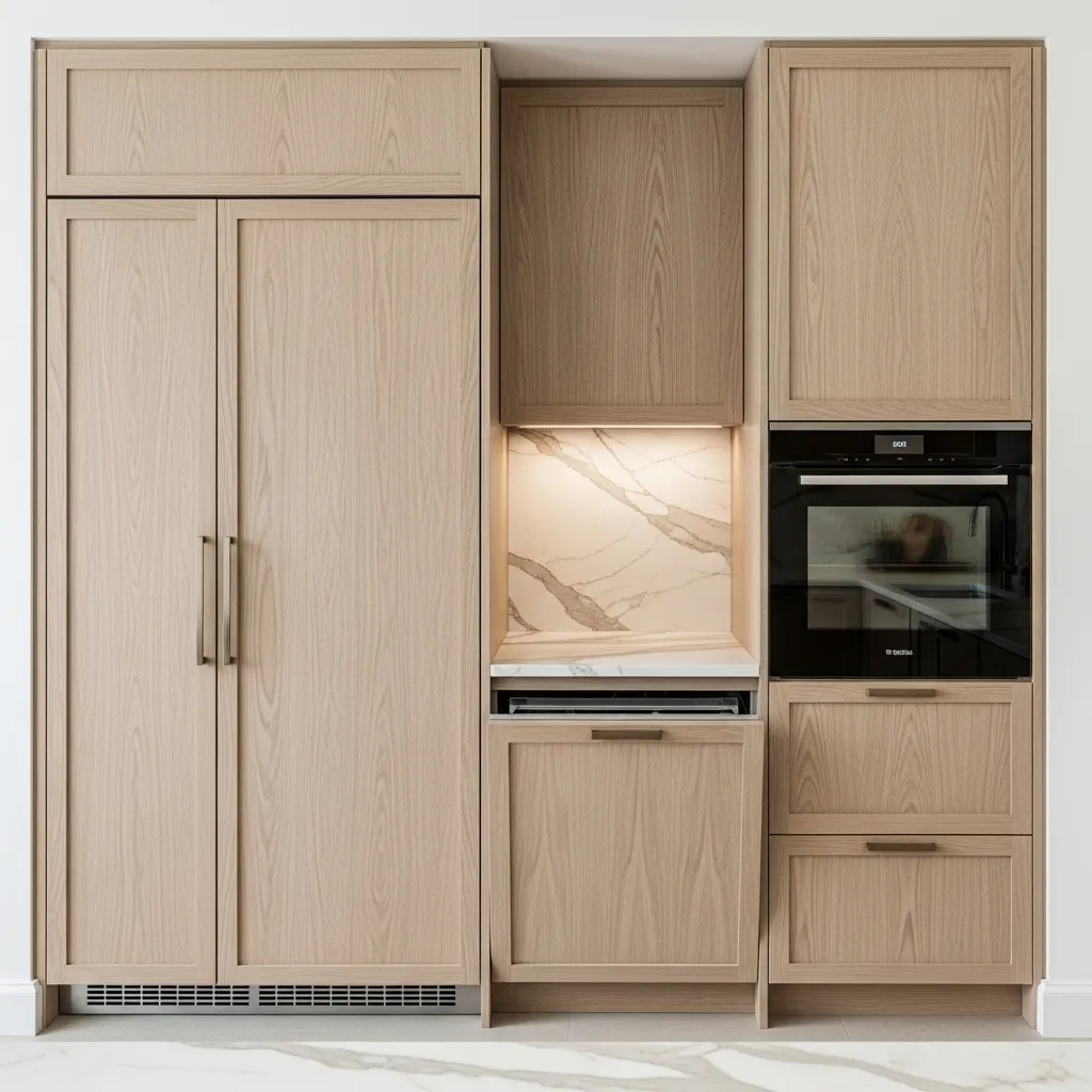 White oak panel-fronted integrated appliances create the most seamless and most architecturally resolved kitchen available — by covering the refrigerator, dishwasher, and any other appliance with white oak panels that match the surrounding cabinetry in grain direction, tone, and profile, the appliances become invisible elements of the wood wall rather than visual interruptions of it. The kitchen transforms from a room equipped with appliances to a room defined by a continuous warm wood surface that happens to contain all the functional equipment of a modern kitchen within it.
