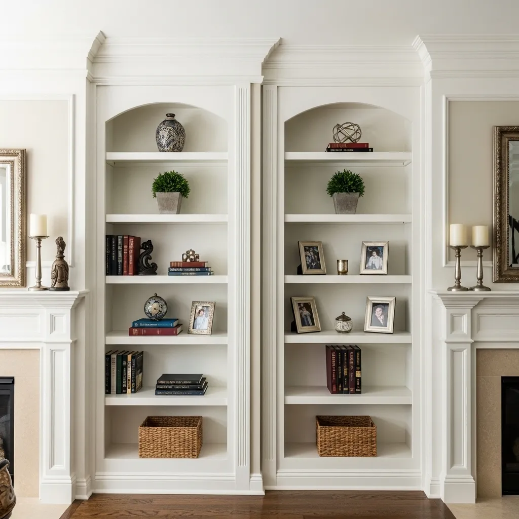 Built-in shelving in alcoves can be designed to match your room’s existing trim and molding, making them feel original to the house rather than added later. Paint them the same color as your walls for a seamless look, or in a contrasting color to make them feature walls. The styling matters enormously with symmetrical alcove shelves—you want some coordinated elements between the two sides without being too matchy-matchy. Maybe similar color schemes, similar proportions in how you arrange items, or thematic connections that create cohesion. These built-ins add genuine value to your home and create beautiful storage and display that works with your architecture rather than fighting it.