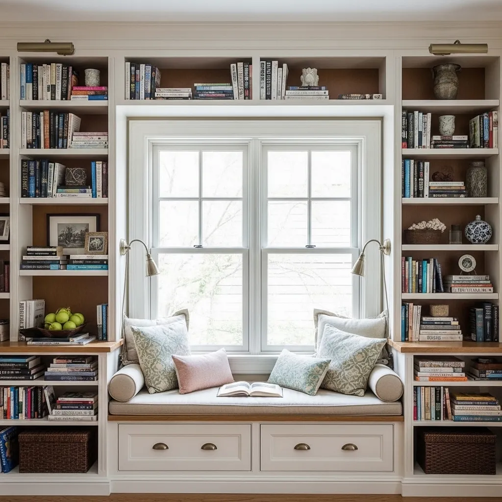 A window seat flanked by built-in bookshelves creates the ultimate reading nook and makes beautiful use of window space that might otherwise be awkward to furniture. The bookshelves on either side create a cozy, embracing alcove that makes the window seat feel like a special destination rather than just extra seating. You’re literally surrounded by books with natural light flooding in—it’s a reader’s paradise.