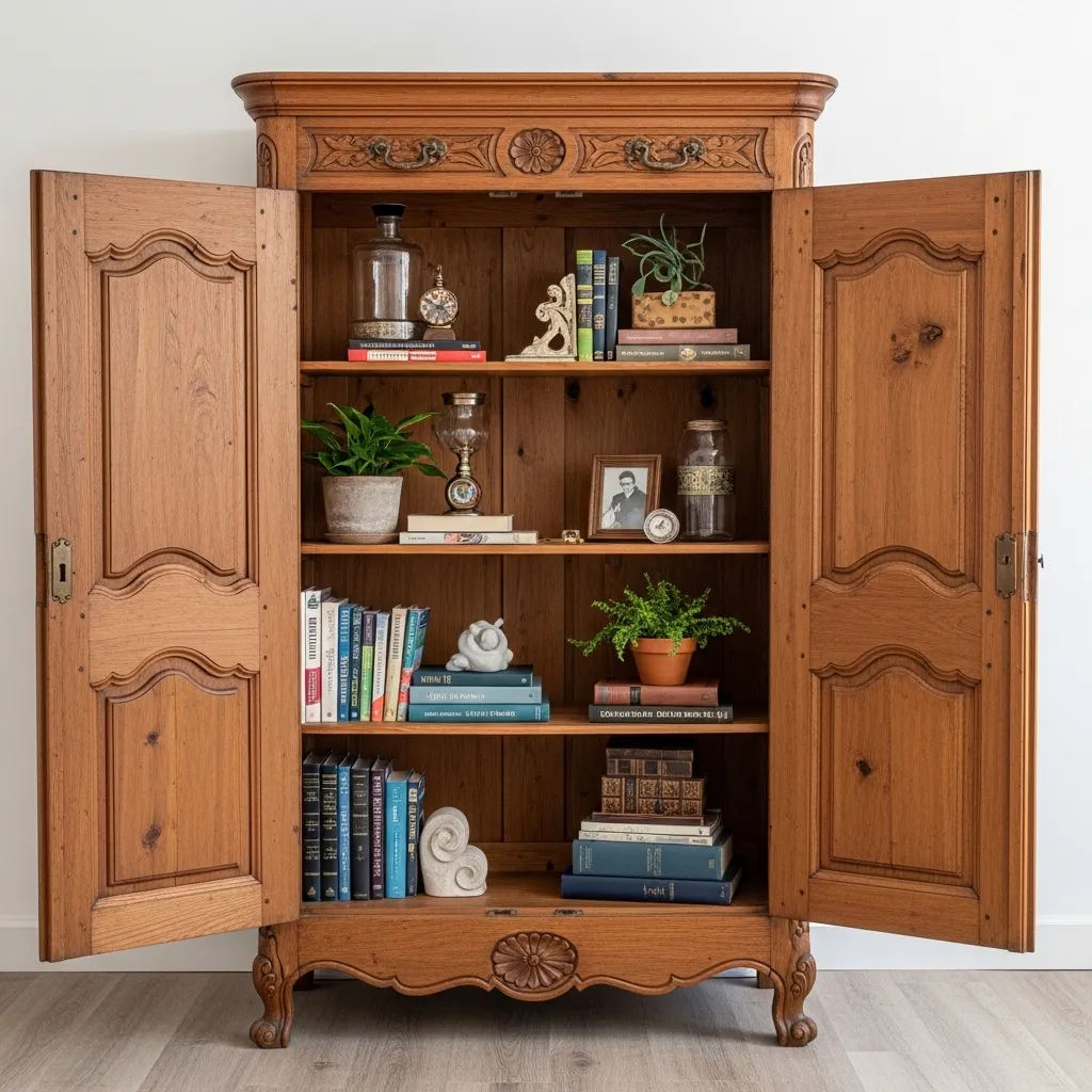 Repurposing a vintage armoire as open shelving by removing the doors creates such a beautiful blend of furniture and storage with genuine character and history. The architectural details of an antique armoire—carved moldings, original hardware, aged wood patina—become the frame for your book display. You get the storage benefits of shelving with the beauty and presence of a statement furniture piece.