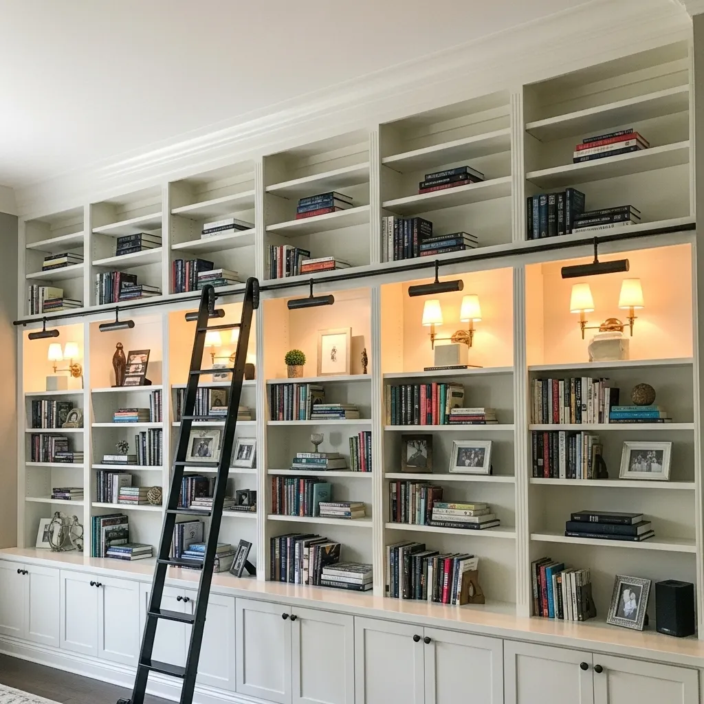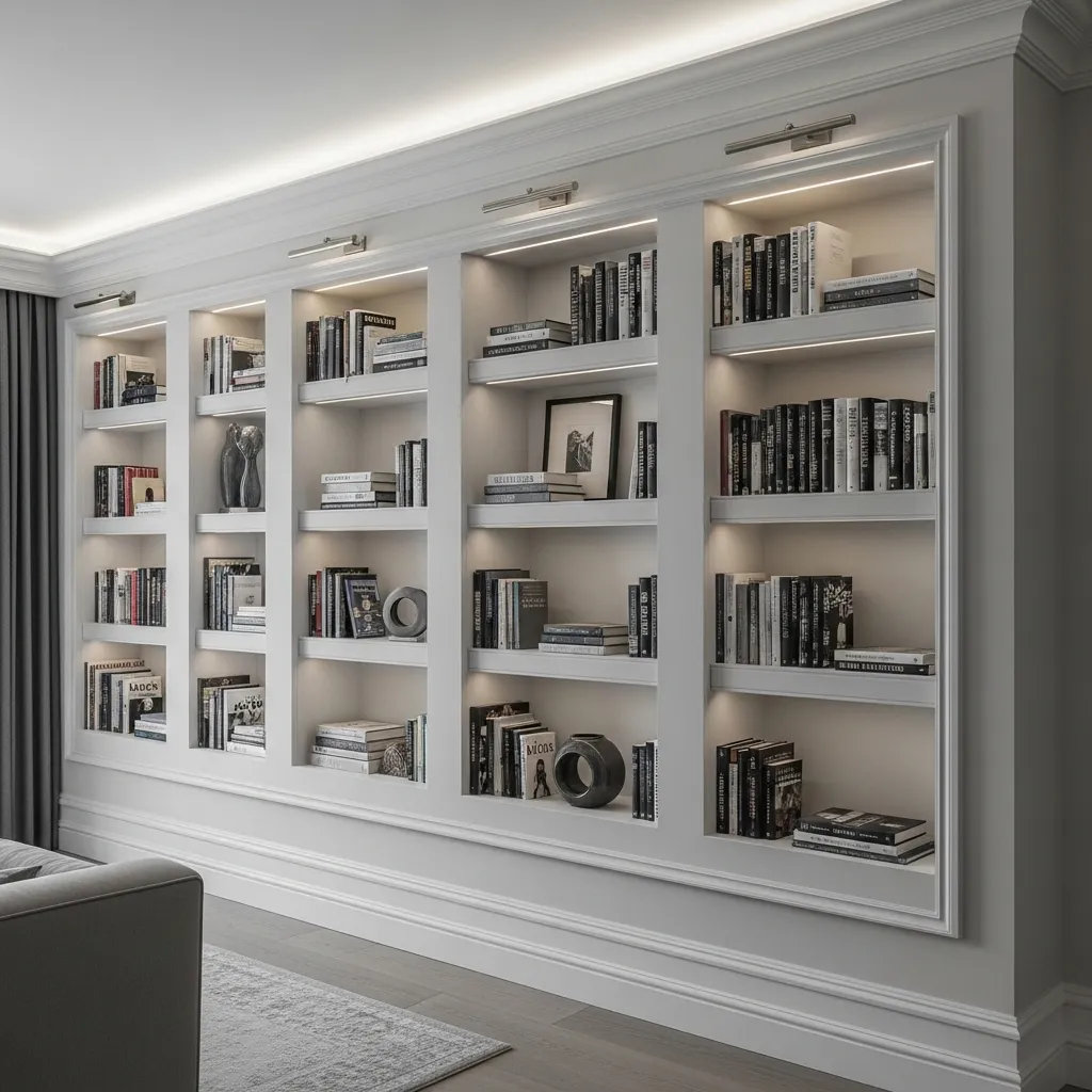 This approach typically requires construction and framing between wall studs or building out the wall to create depth, so it’s more involved than surface-mounted shelving. But the result is incredibly elegant and custom-looking. Painting the shelves the same color as your walls creates a monochromatic, sophisticated appearance where the books and objects provide the color and visual interest. Add subtle lighting—LED strips under shelves or above behind crown molding—to highlight your collection and create ambiance. This works beautifully in formal living rooms, libraries, or primary bedrooms where you want storage to feel integrated and elegant rather than utilitarian.