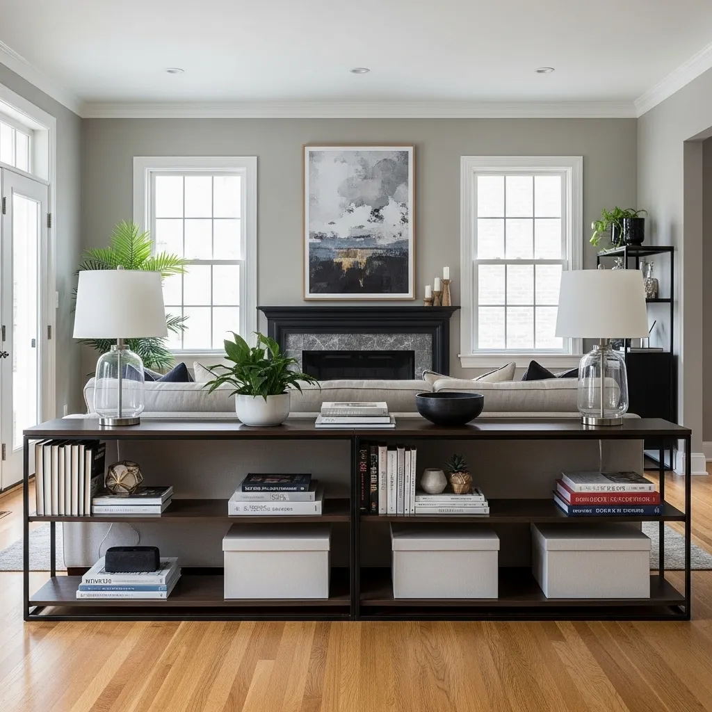 The height relationship is important—the bookshelf should be around the same height as your sofa back or slightly lower so it doesn’t look awkward or create a visual wall. The shelving provides a convenient surface for table lamps, drinks, books you’re currently reading, and decorative objects, essentially functioning like a console table but with the added bonus of book storage. This works particularly well in studio apartments or open-concept spaces where you need to define zones, or when your sofa placement doesn’t allow for it to sit against a wall. Choose a bookshelf with an attractive back finish since it will be visible from the sofa side, or use a double-sided unit.