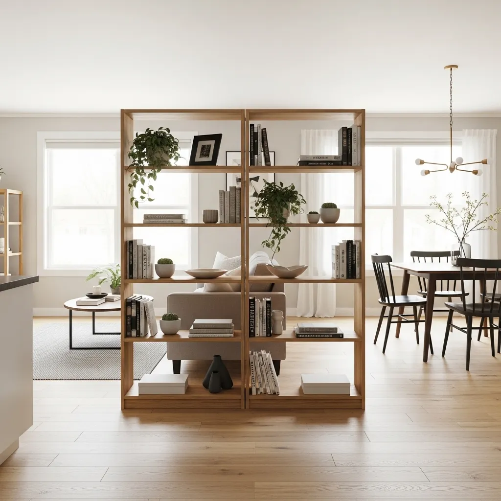 Using a bookshelf as a room divider is such a smart solution in open floor plans where you want to create distinct zones without building walls that close off space or block light. A freestanding bookshelf that’s open on both sides provides storage and display while maintaining visual connection between spaces. It’s separation with transparency, which is exactly what many open-concept spaces need.