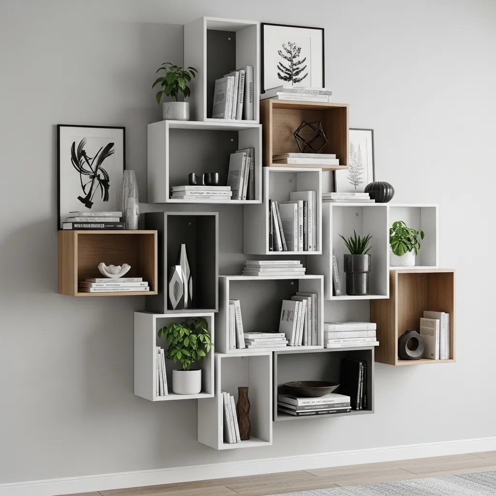 This approach works particularly well in contemporary and modern spaces where you want something visually interesting that breaks from traditional forms. The varying shelf sizes and depths allow you to display different types of objects—small cubbies for decorative items, larger shelves for books, deep boxes for bigger pieces. The key is planning the arrangement thoughtfully so it looks intentional rather than random, with a balanced composition overall even if individual elements are asymmetric. Modular systems make this approach accessible since you can arrange and rearrange components until you find the perfect composition. Style it with careful curation—asymmetrical shelving works best when it’s edited and intentional rather than packed full.