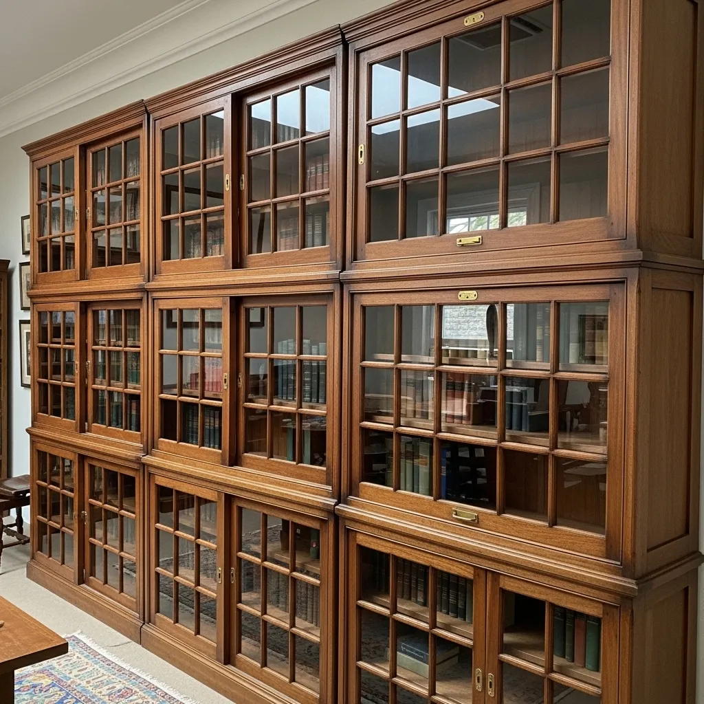 Authentic vintage barrister bookcases can be found at antique stores, estate sales, and online, and they’ve often been beautifully maintained. New reproductions are also available if you want the look without hunting for vintage pieces. The dark wood—typically oak or mahogany—brings richness and traditional elegance, and the brass or metal hardware adds authentic detail. These work wonderfully in traditional, vintage, or eclectic spaces where that historical reference adds character. Stack them floor to ceiling for maximum storage, or use just one or two units for a desk hutch or smaller display. The modular nature means you can start small and add more as your collection grows.