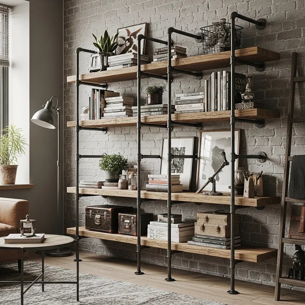 This approach is relatively DIY-friendly for handy people—you can buy pipe fittings and flanges at hardware stores and wood from lumber yards or reclaimed wood suppliers, then assemble according to your exact specifications. The beauty is in the customization and the honest materials. The industrial aesthetic works particularly well in lofts, urban apartments, or any space where you want that raw, unfinished edge. Style these shelves with a mix of books and objects that complement the industrial vibe—vintage finds, plants in simple pots, utilitarian objects. The shelving becomes a feature wall that adds serious character.