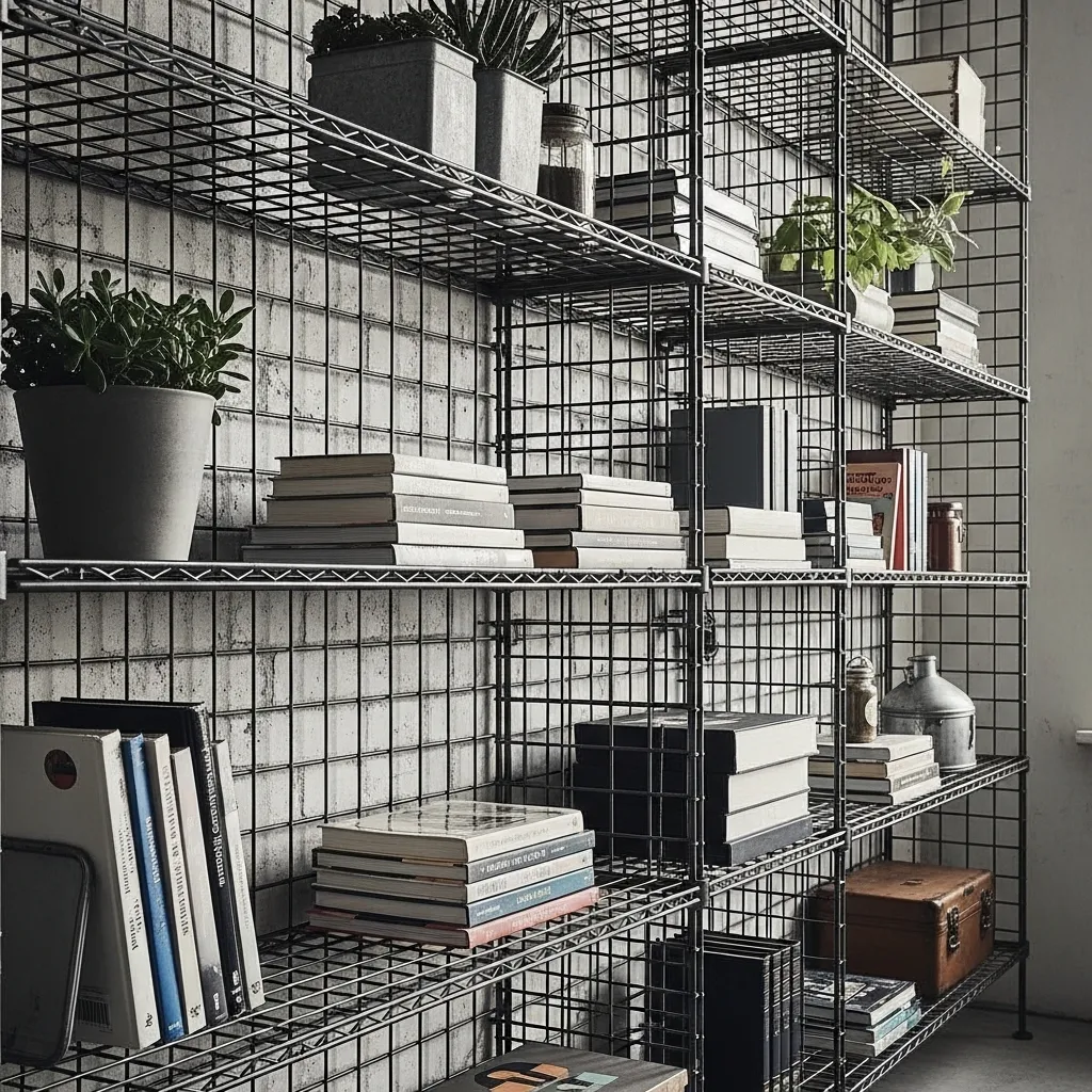 Metal grid or wire shelving brings that authentic industrial, utilitarian aesthetic where function is celebrated rather than hidden. The open wire construction is the opposite of solid wood shelving—it’s transparent, light passes through it, and you can see through it, creating a completely different visual weight. This style references restaurant kitchens, warehouses, and industrial spaces where wire shelving is chosen for practical reasons.