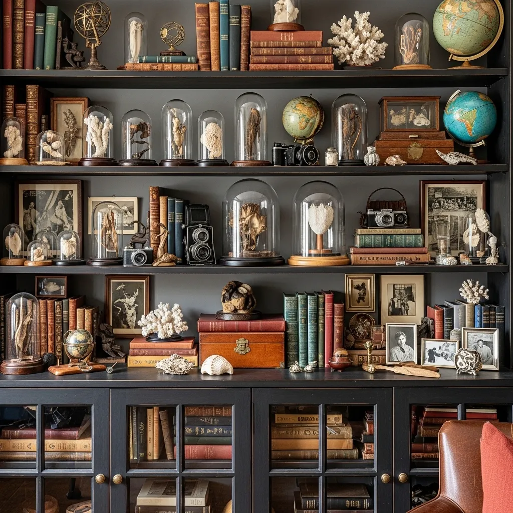 Styling a bookshelf as a cabinet of curiosities creates such visual richness and tells a story about the owner’s interests, travels, and collections. Instead of just books, you’re displaying all the fascinating objects you’ve gathered—vintage finds, natural specimens, travel souvenirs, heirlooms, scientific instruments, whatever speaks to you. The result feels personal, layered, and genuinely interesting rather than just decorative.