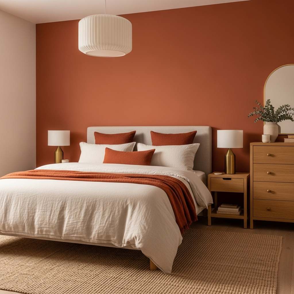 The terracotta specifically creates the bedroom with the most ancient and most specifically warm quality — the color of baked earth, of Mediterranean tile, of the specific warmth of sun-warmed clay — and it creates a room where the color itself feels warm regardless of the actual temperature, where the visual experience of warm terracotta contributes to the perceived warmth of the space in a way that cooler colors don’t. Terracotta also has the specific quality of aging beautifully with the lamp light that cozy bedrooms use — in warm amber lamplight, terracotta walls appear to glow with their own internal warmth.