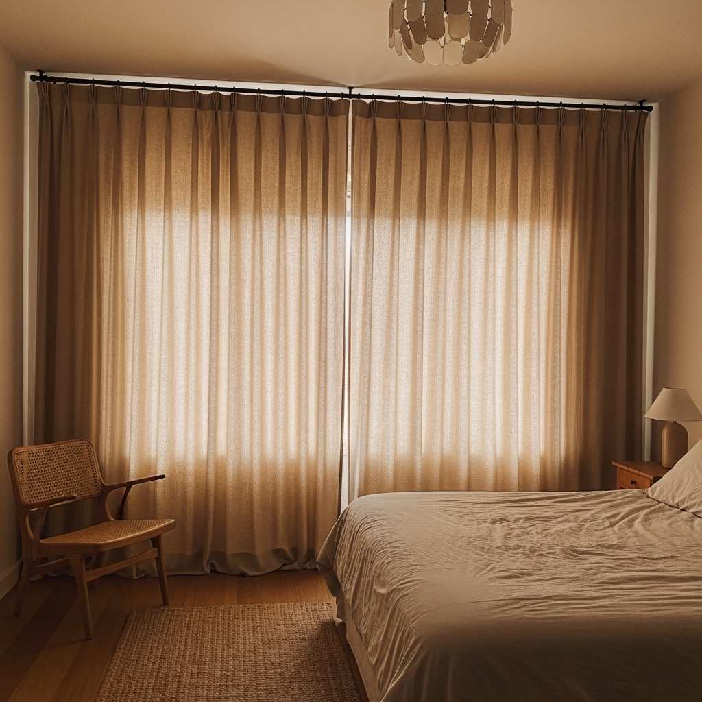 Floor-to-ceiling curtains hung from ceiling-height rods — the most common curtain specification mistake being rods hung just above the window rather than at the ceiling — create the single most dramatic bedroom visual transformation available from a single element change. Curtains hung at ceiling height make the ceiling appear dramatically higher, the windows appear dramatically larger, and the room appear dramatically more designed than curtains hung at the standard above-window height, because the floor-to-ceiling drop of fabric treats the window as an architectural opportunity rather than a functional opening.