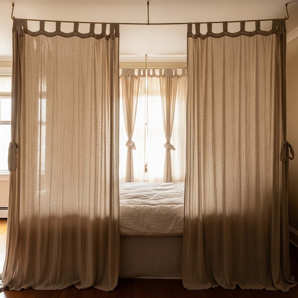 The sheer linen specifically is the fabric that creates the most beautiful canopy because it provides enclosure without darkness — the semi-transparency of sheer linen lets the morning light filter through in a warm, diffused quality that waking up to is genuinely pleasurable, while providing enough visual separation between the sleeping zone and the surrounding bedroom that the enclosed feeling is real rather than suggested. The linen’s natural cream-white tone creates warmth rather than the clinical quality that pure white sheer fabrics can create.