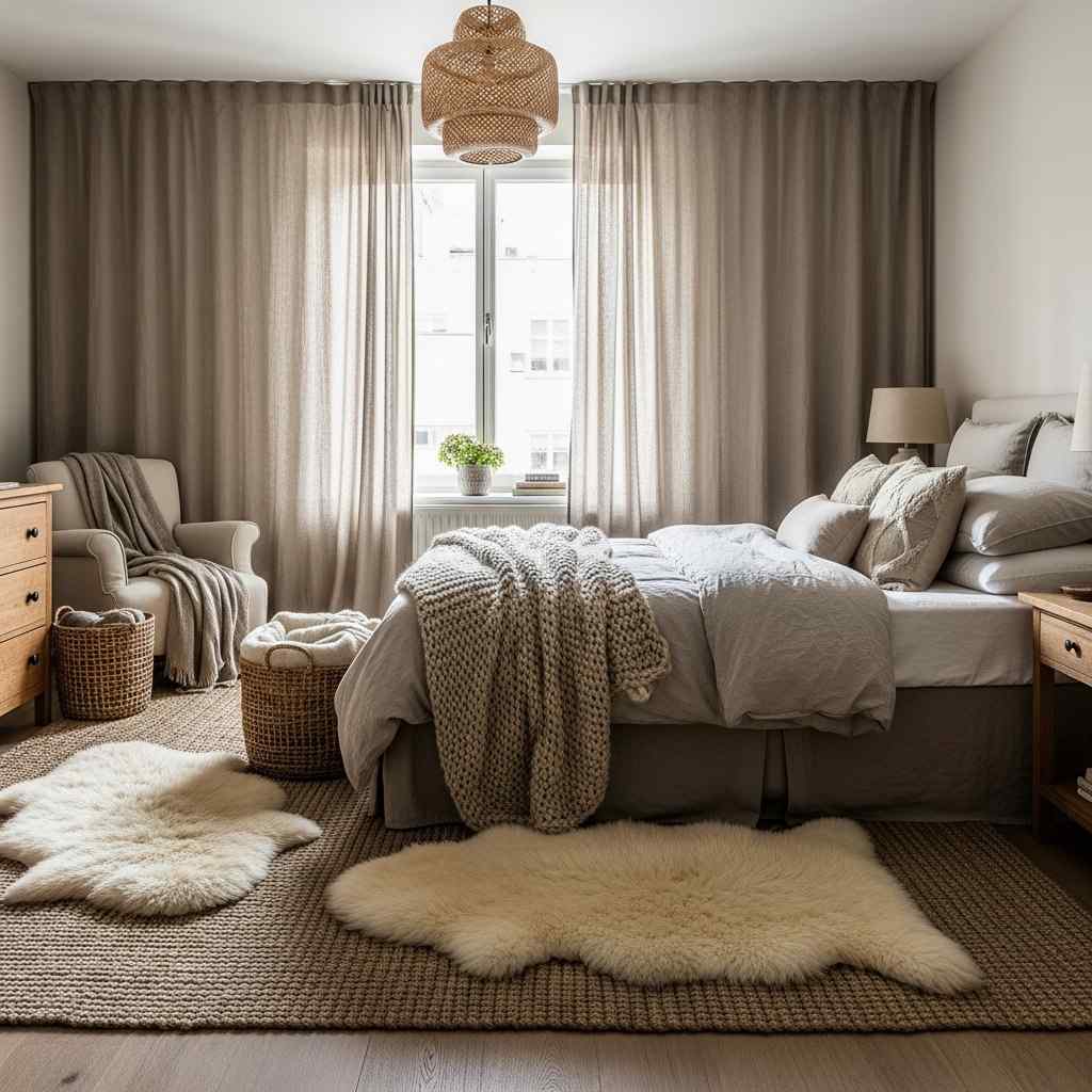 The specific natural fibers that create the most warmth and the most sensory richness are wool, linen, cashmere, cotton, and sheepskin — all natural, all aging beautifully, all providing genuine thermal warmth as well as visual warmth. The combination of these different natural textures throughout the room creates a material world of extraordinary sensory variety — the rough warmth of a jute rug, the smooth coolness of linen sheets, the dense warmth of a wool throw, the cloud-like softness of a sheepskin — and that variety creates sensory richness that a single-texture room, however luxurious its individual textile, can’t achieve.