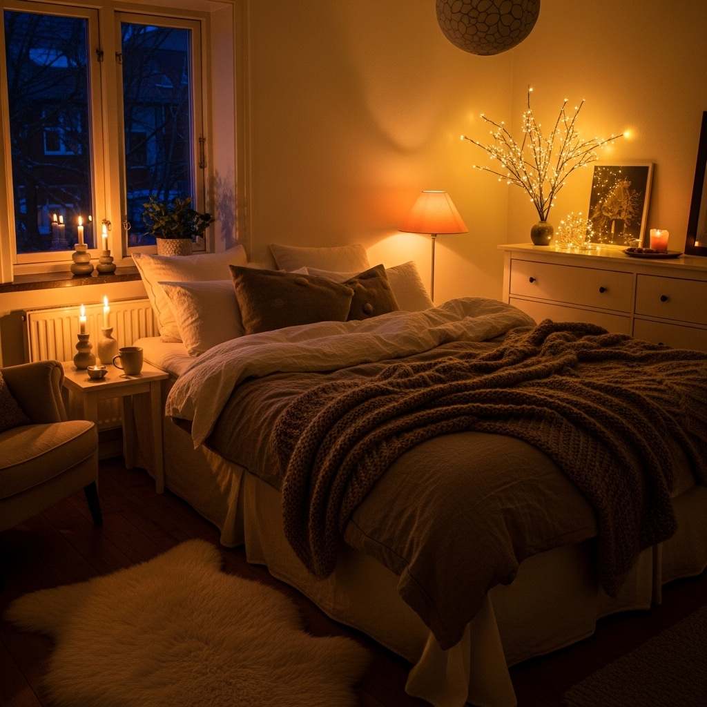 The specific warmth of the lamp bulbs is the technical detail that most determines the quality of this transformation — 2700K warm white bulbs create the amber quality closest to candlelight and most associated with genuine coziness, while 3000K creates a slightly brighter warm white that works well for reading while maintaining warmth, and anything above 3000K creates a quality of light that reads as work lighting rather than rest lighting. The investment in warm bulbs throughout every lamp in the bedroom is the lowest-cost, highest-return atmospheric improvement available.