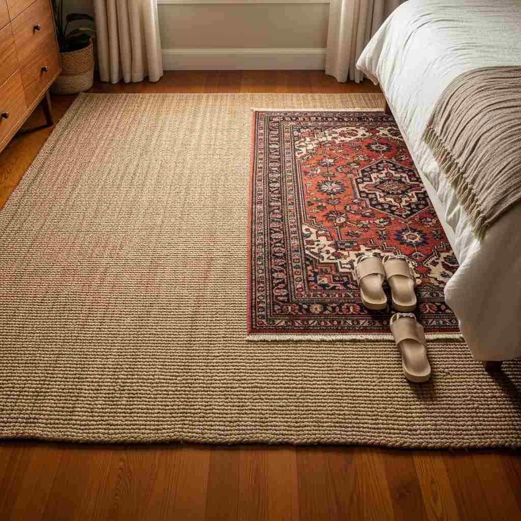 Floor rug layering in a bedroom — a large natural fiber base rug with a smaller, more characterful rug on top — creates the warmest and most visually rich bedroom floor treatment available at any budget level, because the layering multiplies the floor’s warmth, its tactile quality, and its visual interest in a way that a single rug, however large or however beautiful, doesn’t achieve alone. The large base rug creates coverage and warmth across the full floor; the smaller patterned rug creates the visual interest and personality that a uniform large rug lacks; and their combination creates a floor that reads as both spatially generous and specifically designed.
